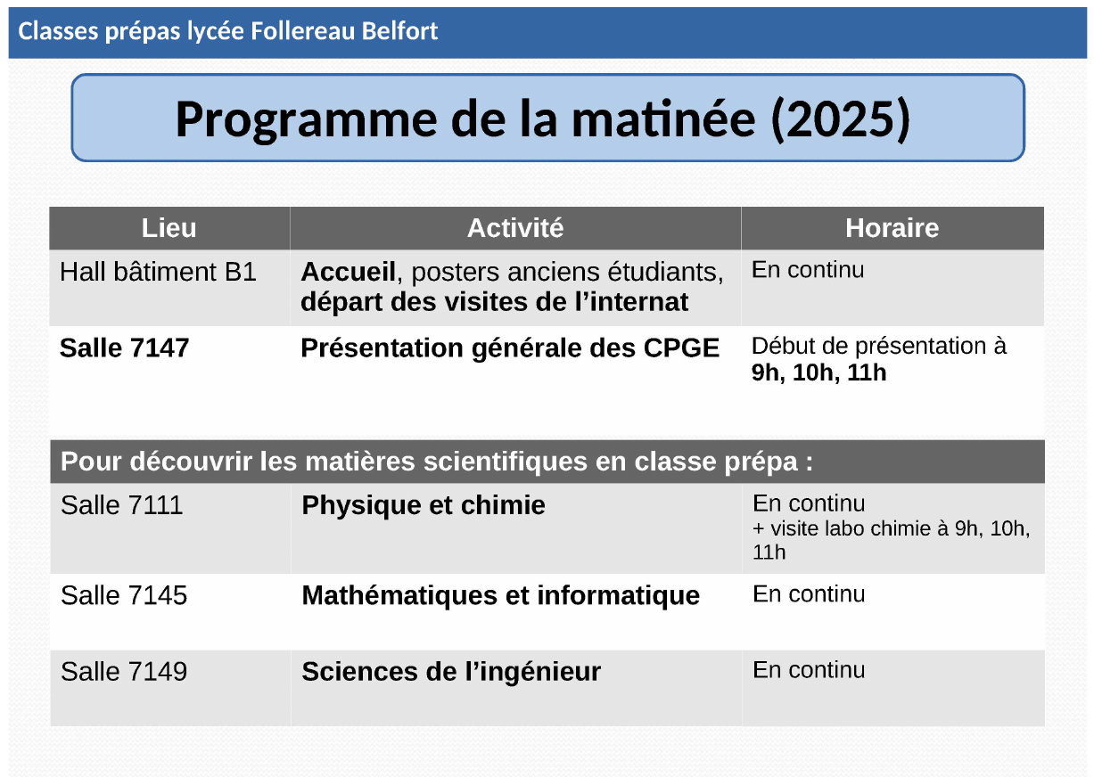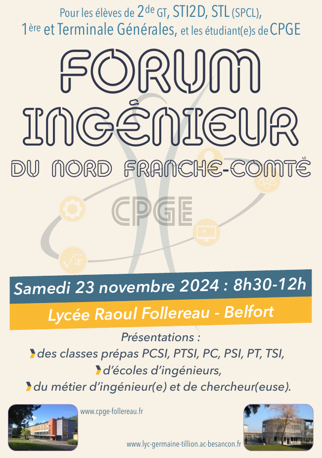 Public concerné : lycéennes et lycéens (terminale), Durée : 14h-16h le mercredi. Cliquer sur la brochure ci-contre pour plus d'informations. novembre 2023 Forum métier d'ingénieur, avec présence d'anciens élèves : samedi 18 novembre 2023, 8h30-12h30, entrée libre. Présentations des classes prépas PCSI, PTSI, PC, PSI, PT et TSI, d'écoles d'ingénieurs et du métier d'ingénieur(e) et de chercheur(e), avec le lycée Germaine Tillion de Montbéliard.