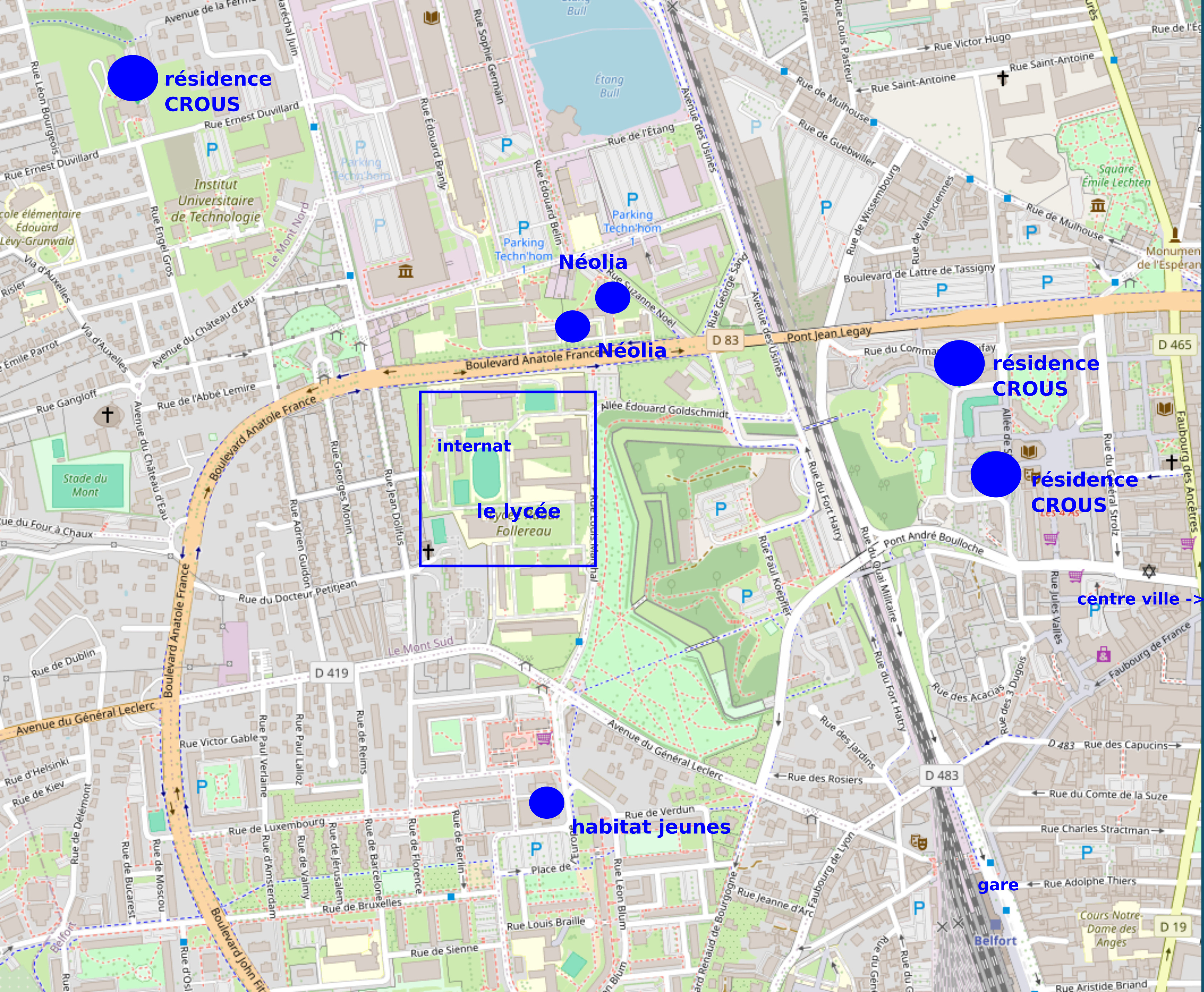 Résidences Néolia (lien). Les deux résidences de Belfort, boulevard Anatole France et rue Suzanne Noel, sont à côté du lycée.